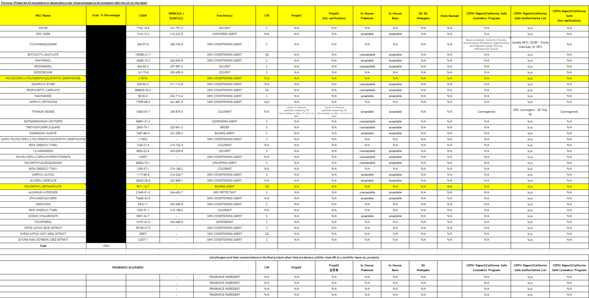 We create a Formula Review Worksheet (FRW) according to the format required by major U.S. distribution channels. This FRW covers CIR (Cosmetic Ingredient Review), Prop 65 (carcinogenic substances), the California Safe Cosmetics Act, state-banned ingredients, and the European Commission inventory. For any ingredients not proven safe by the CIR, we verify whether they should be classified as Warning/Danger. We also check the strict standards set by major U.S. distribution channels—such as Whole Foods Market—before finalizing the FRW.